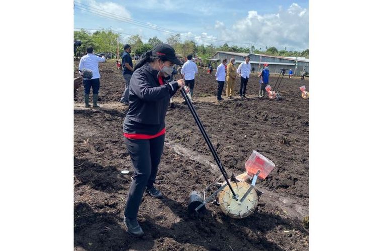 Ketua DPR RI Puan Maharani menanam jagung dalam kunjungan kerja bersama Presiden Joko Widodo (Jokowi) di Kawasan Jalan Rajawali, Kelurahan Klamesen, Distrik Mariat, Kabupaten Sorong, Senin (4/10/2021).