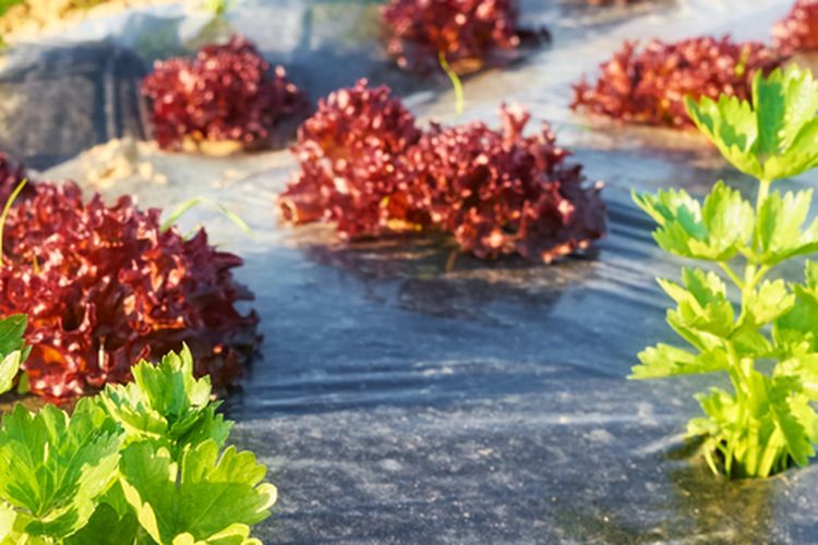 Ilustrasi penggunaan mulsa plastik di kebun sayuran.
