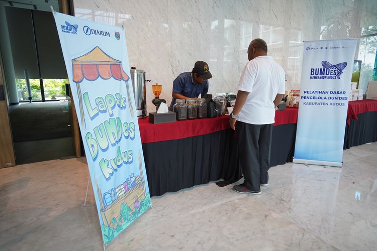 BUMDes Tunggak Jati Japan, Desa Japan, Kecamatan Dawe, menjajakan kopi dan beragam produk UMKM desa selama pelatihan BUMDes oleh PT Djarum. (DOK PT DJARUM)
