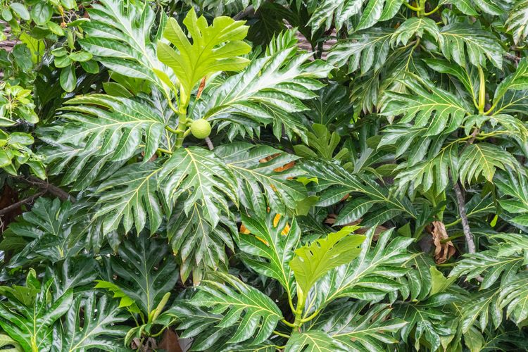 Ilustrasi pohon sukun, tanaman sukun, daun sukun.