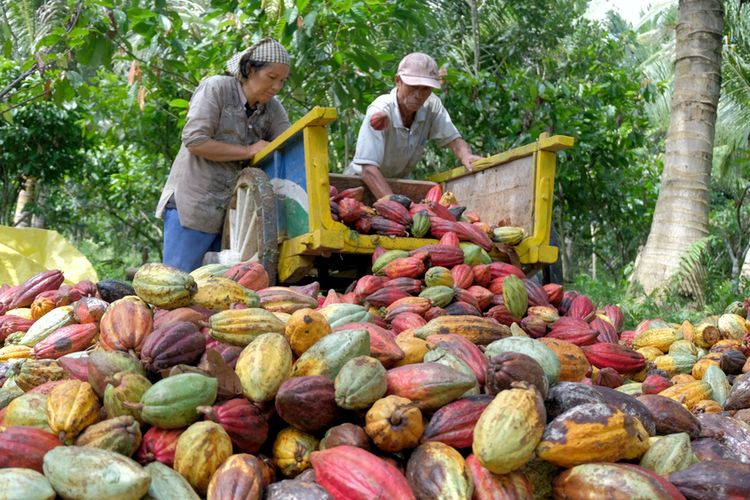 Ilustrasi Petani Kakao di Sulawesi sedang mengangkut hasil panen.